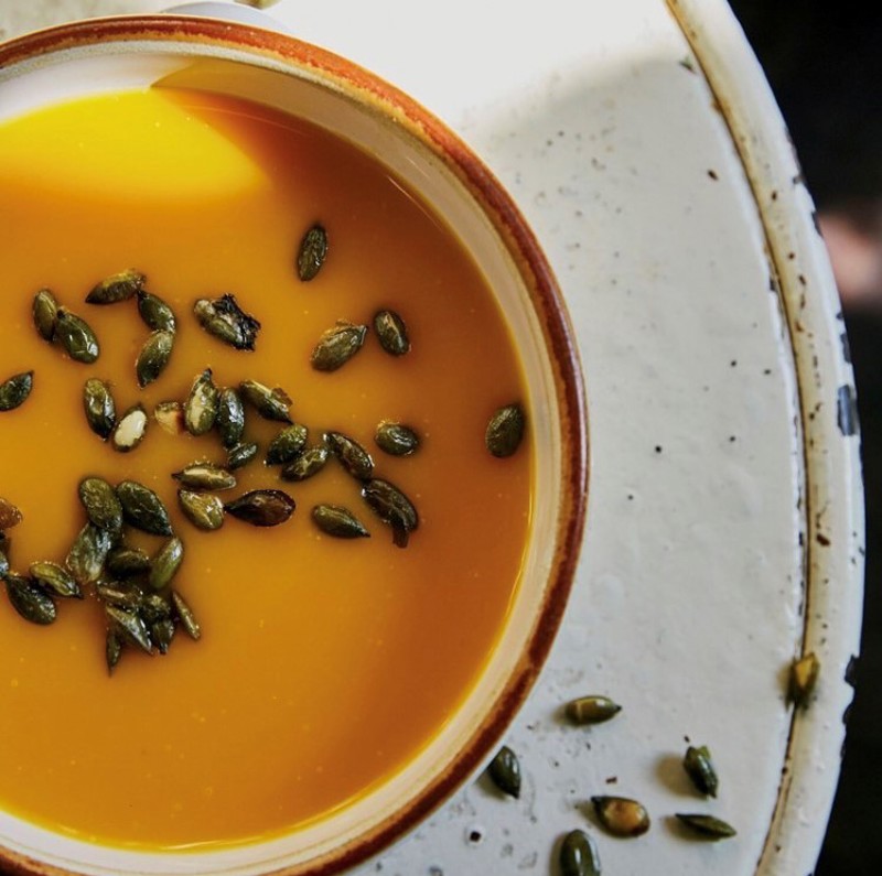 We have a spiced carrot soup with garden herb infused oil as a starter, also we have Crown Prince Squash risotto served with English Pecorino and crispy sage from the garden. The Crown Prince squash is one of the best varieties we grow, it always produces many fruits which have a pale blue skin, deep orange flesh with a nutty/velvety flavour.