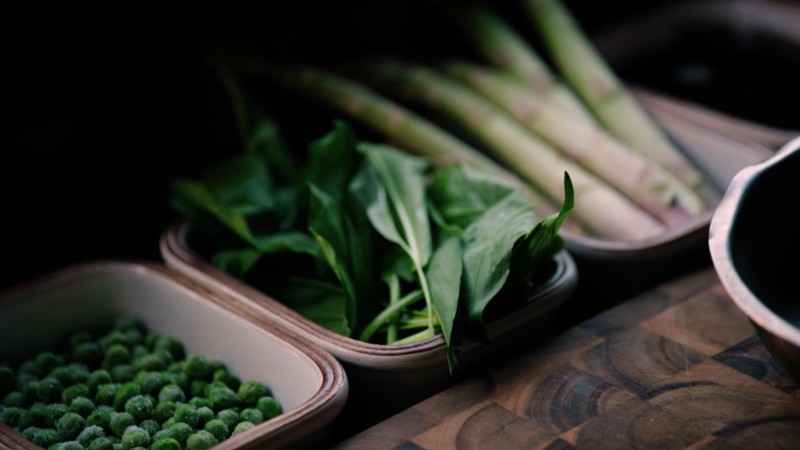 - While the lamb finishes, blanch the peas and asparagus in salted boiling water for 1–2 minutes until just tender. Refresh in iced water to keep them bright. In a separate pan, melt a knob of butter, then gently wilt the wild garlic for 30 seconds. Stir in the peas and asparagus to warm through. Season with a pinch of salt and a little lemon zest to finish.
