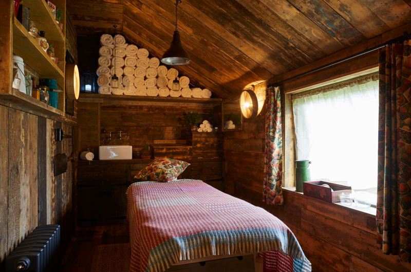 We are outside, surrounded by the countryside and medicinal herbs and, of course we have the beautiful Kitchen Gardens close by - we really cannot complain about our office! Our Potting Sheds are made from reclaimed wood and are the cosiest treatment rooms that I have ever worked in. When a guest walks in and lays down for their treatment the Potting Shed magically turns into a quiet and tranquil treatment room.