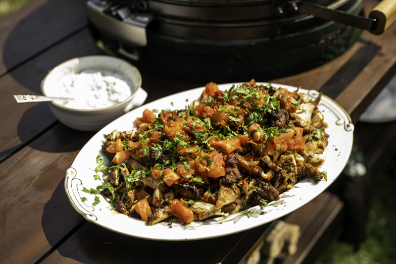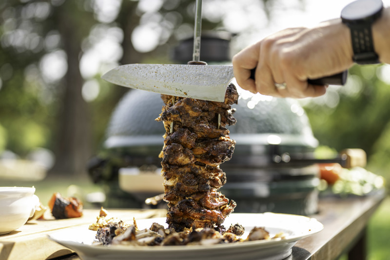 - Take the kebab off the Big Green Egg, carve the meat off the spit and top with the chopped blackened tomatoes and freshly chopped parsley (or par-cel).
