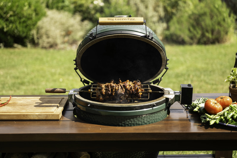 - Place the rotisserie on the Big Green Egg and turn on. Allow to cook for approximately 2 hours until the juices run clear.