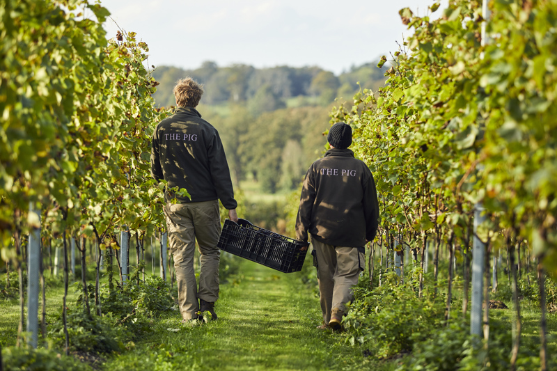 As autumn hues grace the hills of THE PIG-in the South Downs, a significant milestone has also arrived at our picturesque spot in the countryside. This October, for the first time ever, our team took to the vines to pick our homegrown grapes – marking a momentous beginning in our winemaking journey.