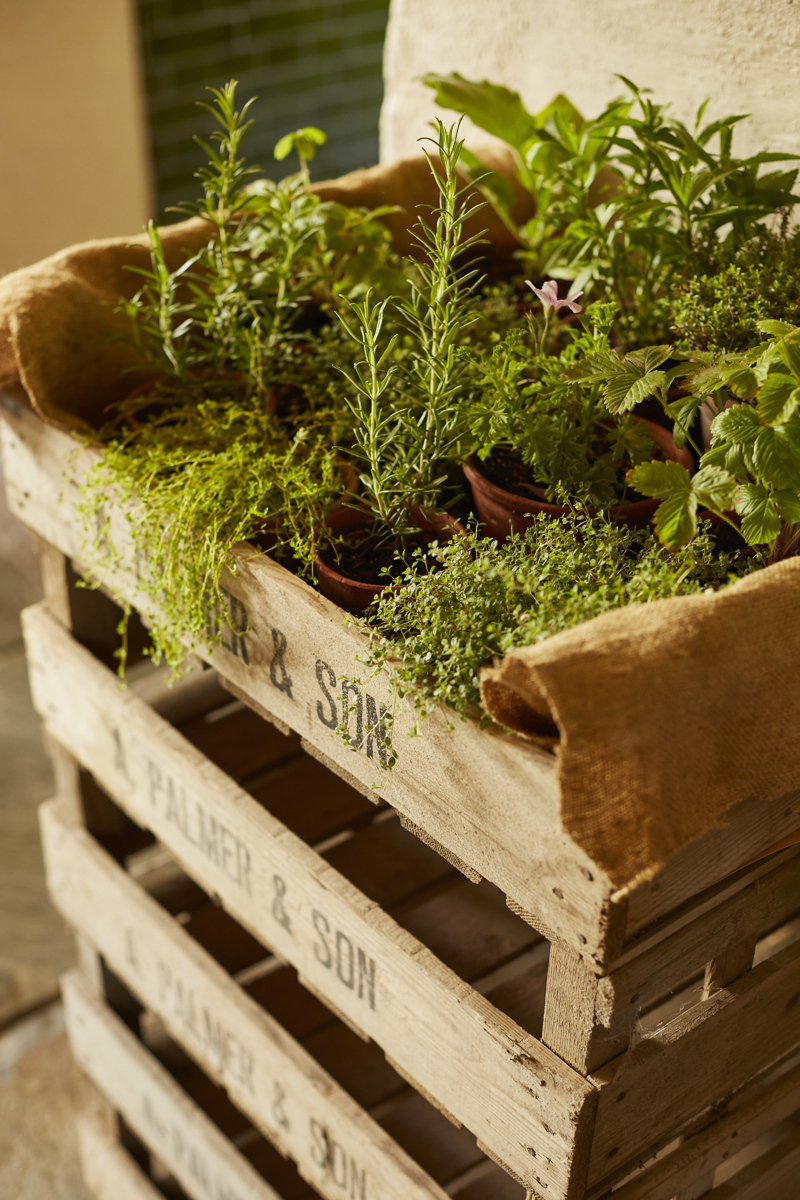Add a glass top to an old crate and you can use it as a coffee table sideways on, or a bedside table end up.