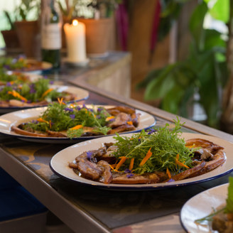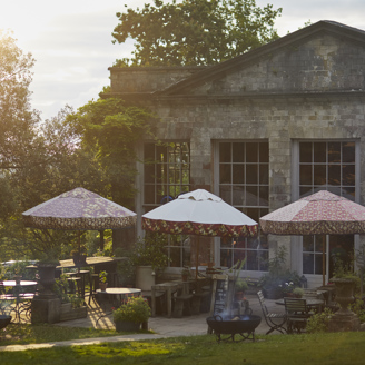 Tucked deep in the gardens, The Folly is our rustic hideaway with stripped back walls, floor to ceiling windows, and is full of reclaimed furniture. Sit down inside for a 3-course feasting menu, and spill out onto the flagstone terrace with views that are hard to beat!