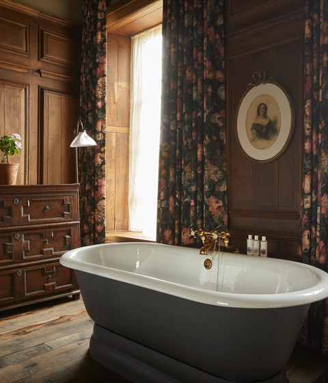 Our Big Comfy Luxe bedrooms are tucked in the main house and the coach house. Each one has a very comfortable super king-sized bed, a large walk-in monsoon shower and a freestanding roll top bath – some of which are in the bedroom. Some of the Big Comfy Luxe Rooms in the coach house are double height with mezzanine-level bathroom and overlook the beautiful water meadows.