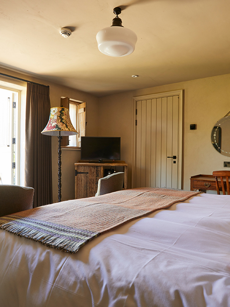 Very big and seriously comfy bedrooms tucked in the main house or in the Stonehouse (quite literally a stone’s throw away!) with a private outdoor terrace – each with their own beautiful views out across the courtyard, orchard and gardens. Inside, you’ll find a big freestanding roll top bath (some of which are in the bedroom), a large comfy bed, and a monsoon shower in the separate bathroom.