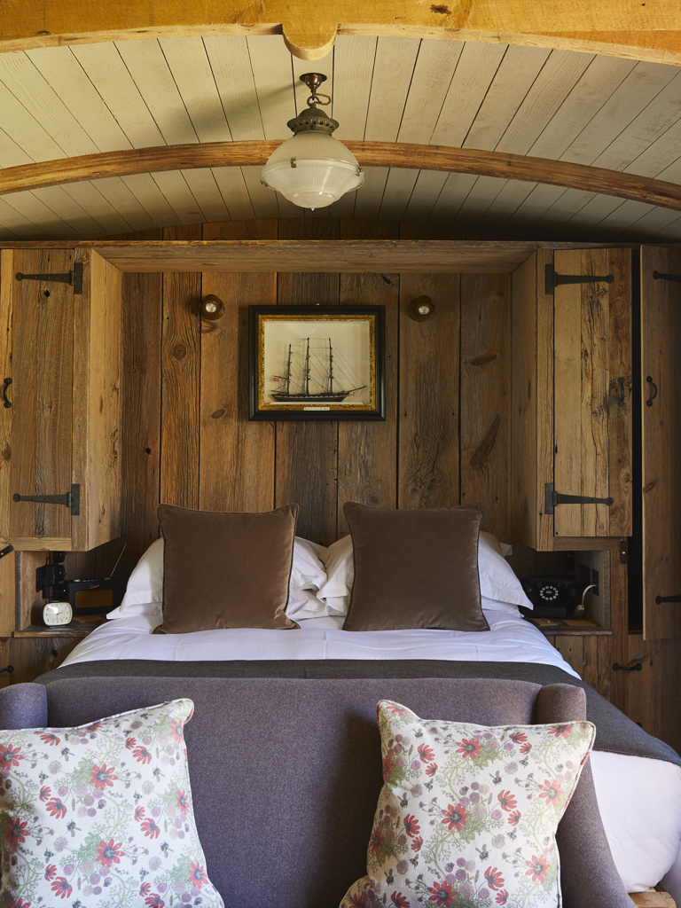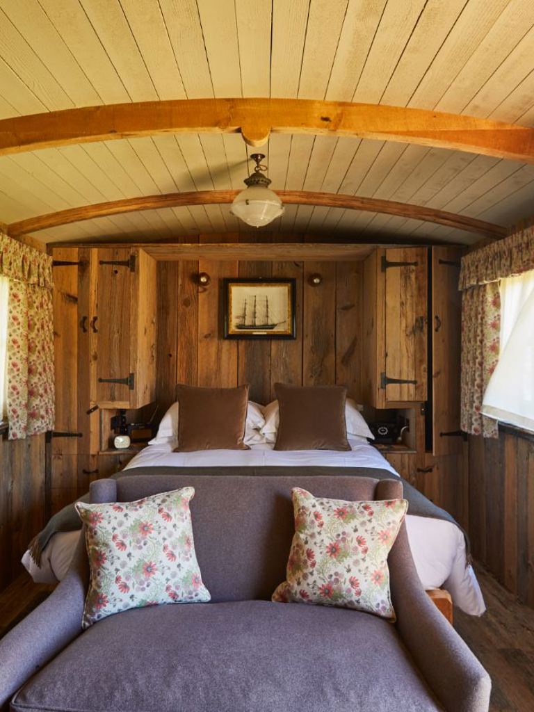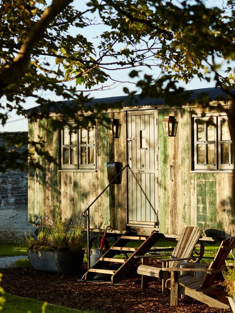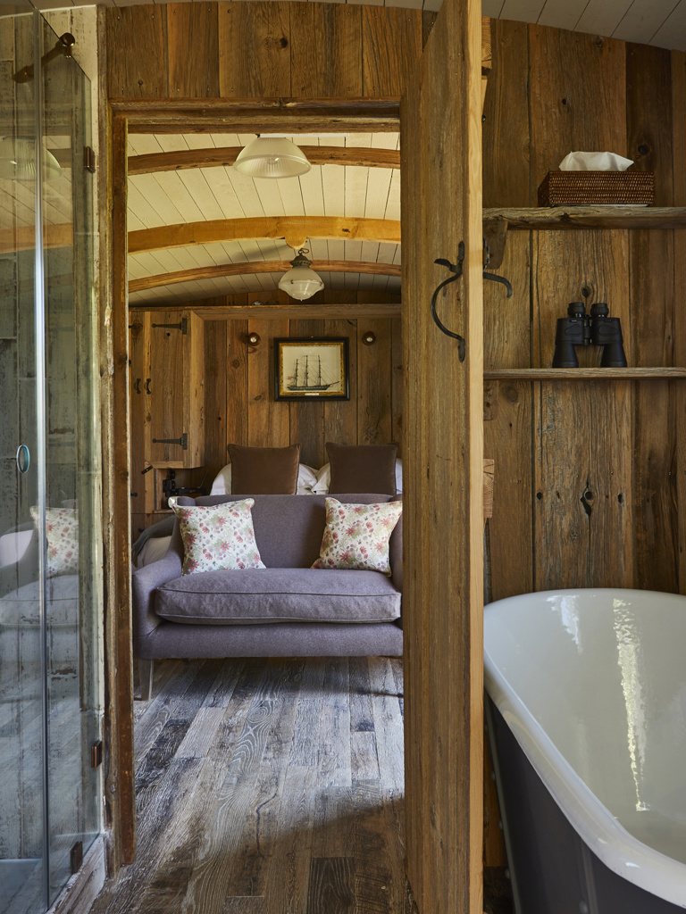 Packed with all the comforts of a bedroom in the main house, these bespoke romantic wagons are tucked away around the veg patches with views out across the gardens and fields. Full of rustic reclaimed wood and texture, cosy furnishings and each with its own log burner and sofa to snuggle up on, these Wagons have king-sized beds and en-suite bathrooms with monsoon showers, freestanding baths and bags of space for two. They also have their own private terraces and private outdoor showers for alfresco showering.