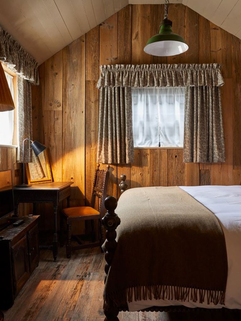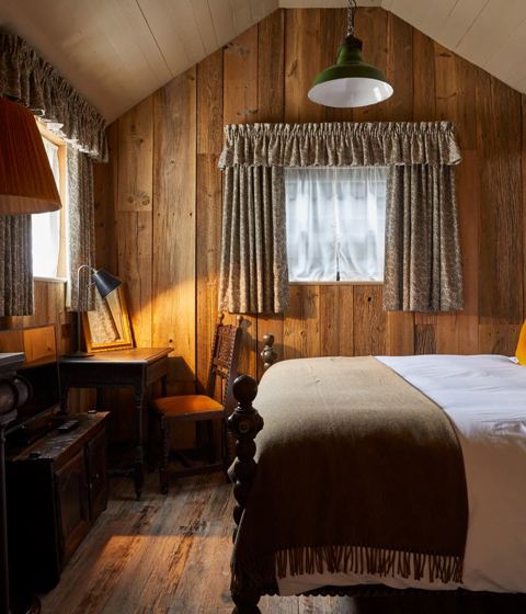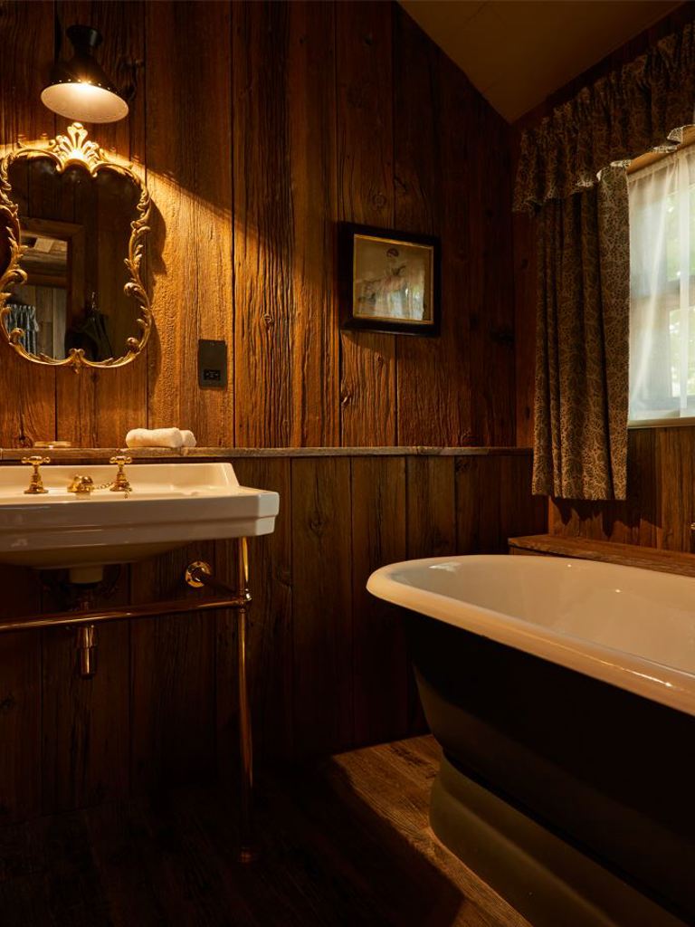 Our comfy yet seriously spacious wood clad hut stands on its own in the stable yard with an outside, leafy seating area. Gracie’s Shed has a super cosy king-sized four-poster bed and separate bathroom with a freestanding roll top bathtub and walk-in monsoon shower. This big bedroom is close to the main house, hidden under the shade of an ancient lime tree.