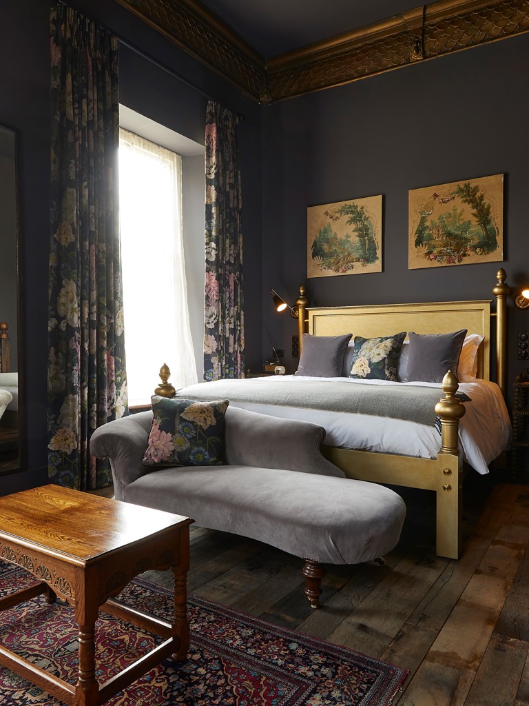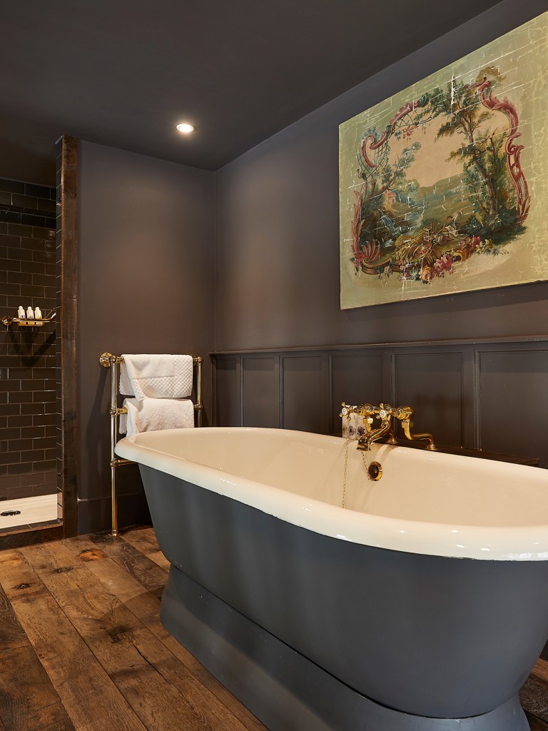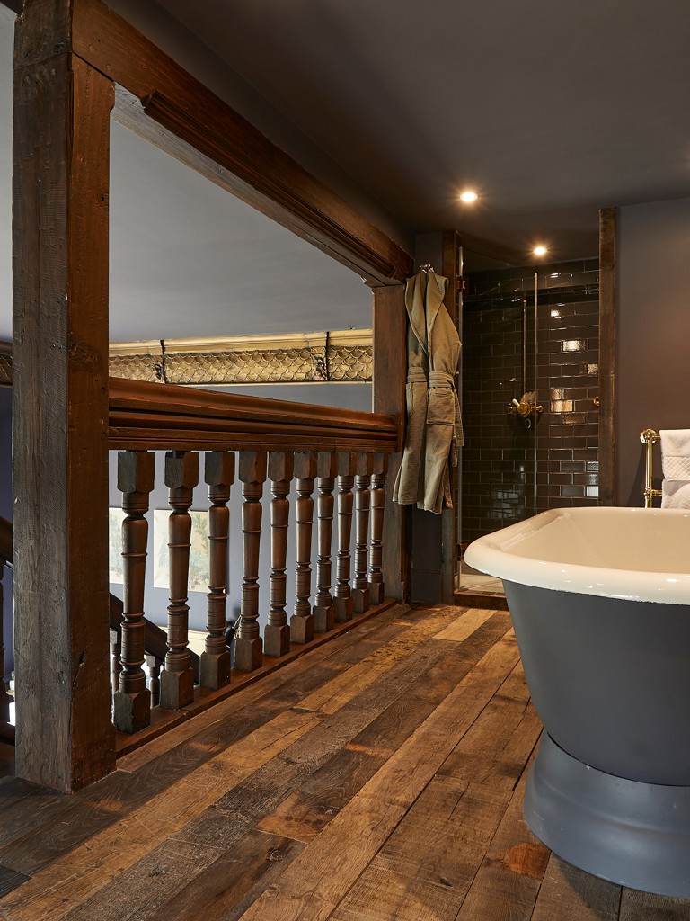 This truly unique bedroom is nestled in the main house and has dark, cosy furnishings with rustic wooden floors. Walk into your living room and large master bedroom on the ground floor with a super king four-poster bed and chaise lounge – then take the staircase up to the mezzanine bathroom where you’ll find a walk-in monsoon shower and freestanding roll top bath.