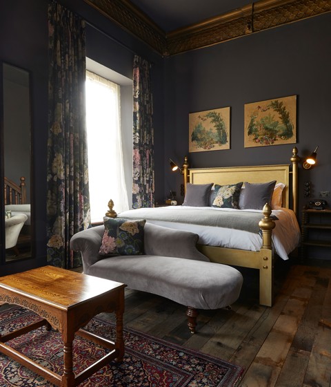 This truly unique bedroom is nestled in the main house and has dark, cosy furnishings with rustic wooden floors. Walk into your living room and large master bedroom on the ground floor with a super king four-poster bed and chaise lounge – then take the staircase up to the mezzanine bathroom where you’ll find a walk-in monsoon shower and freestanding roll top bath.