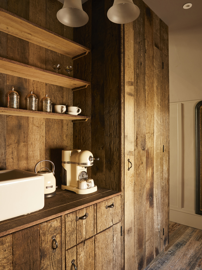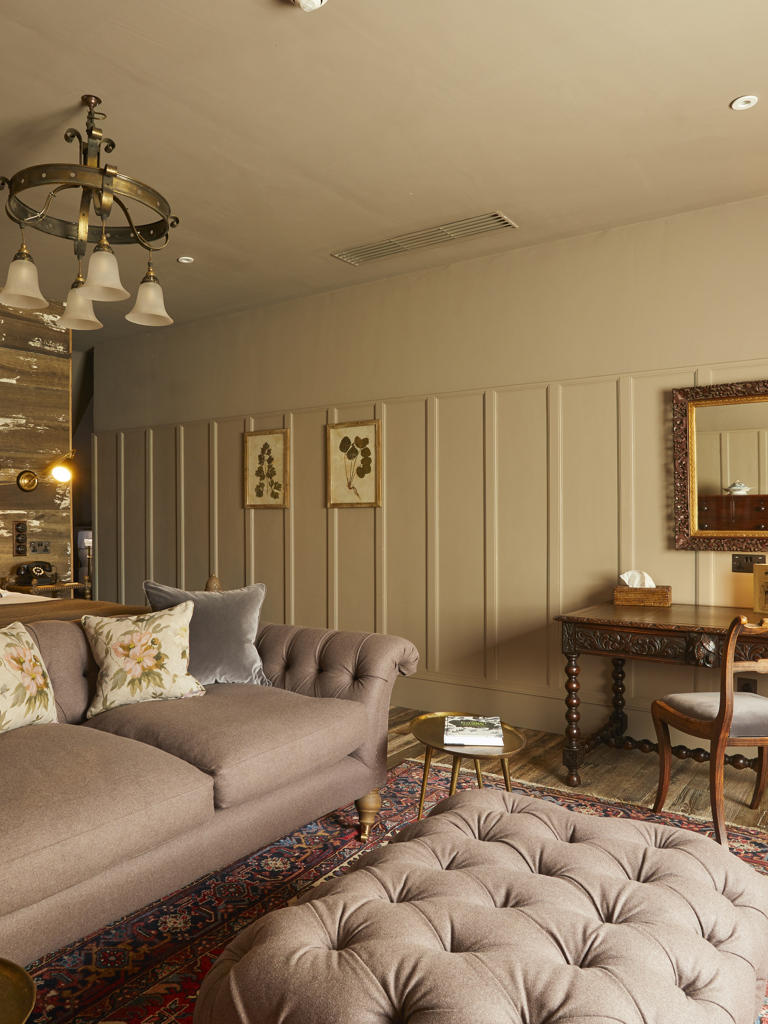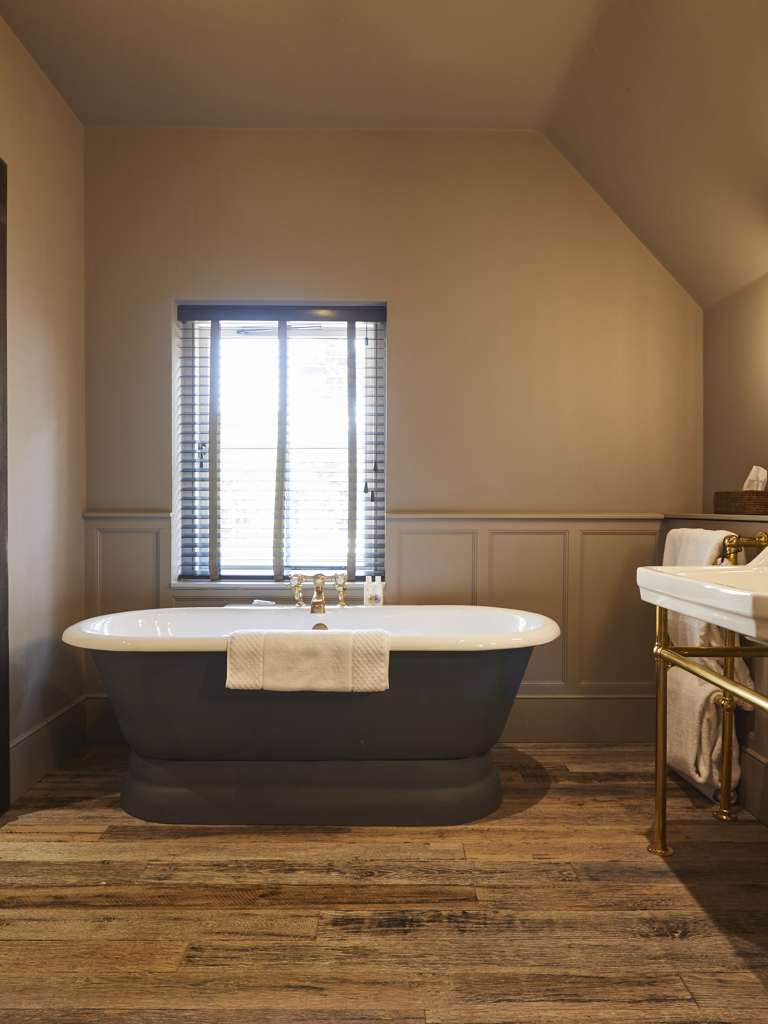 This very spacious bedroom is tucked away in the coach house with views out across the beautiful water meadows and the Kitchen Garden. Inside, it’s furnished throughout with cosy rustic wood and light panelled walls and has a super king-sized bed in the centre of the room – rest and relaxation is the main focal point! There’s a separate large bathroom with a walk-in monsoon shower, two sinks, and a freestanding roll top bath to let yourself unwind in.