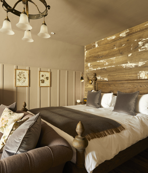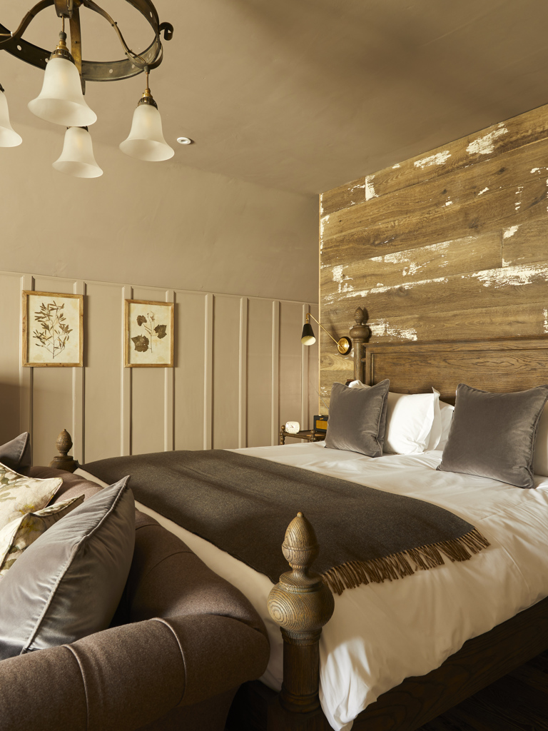 This very spacious bedroom is tucked away in the coach house with views out across the beautiful water meadows and the Kitchen Garden. Inside, it’s furnished throughout with cosy rustic wood and light panelled walls and has a super king-sized bed in the centre of the room – rest and relaxation is the main focal point! There’s a separate large bathroom with a walk-in monsoon shower, two sinks, and a freestanding roll top bath to let yourself unwind in.