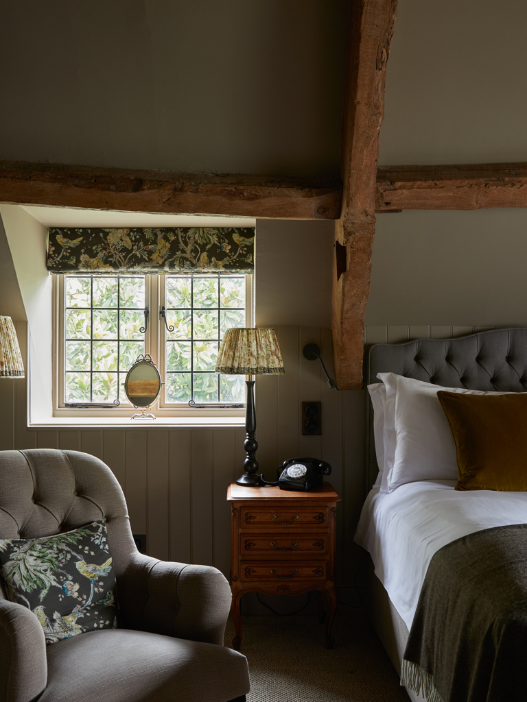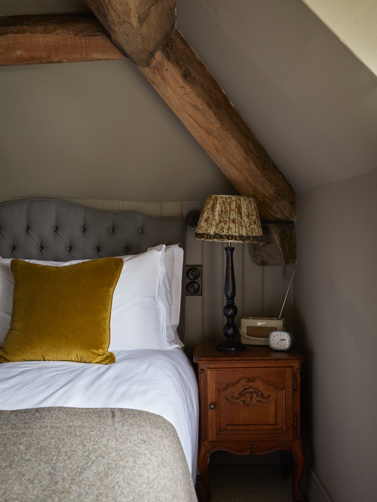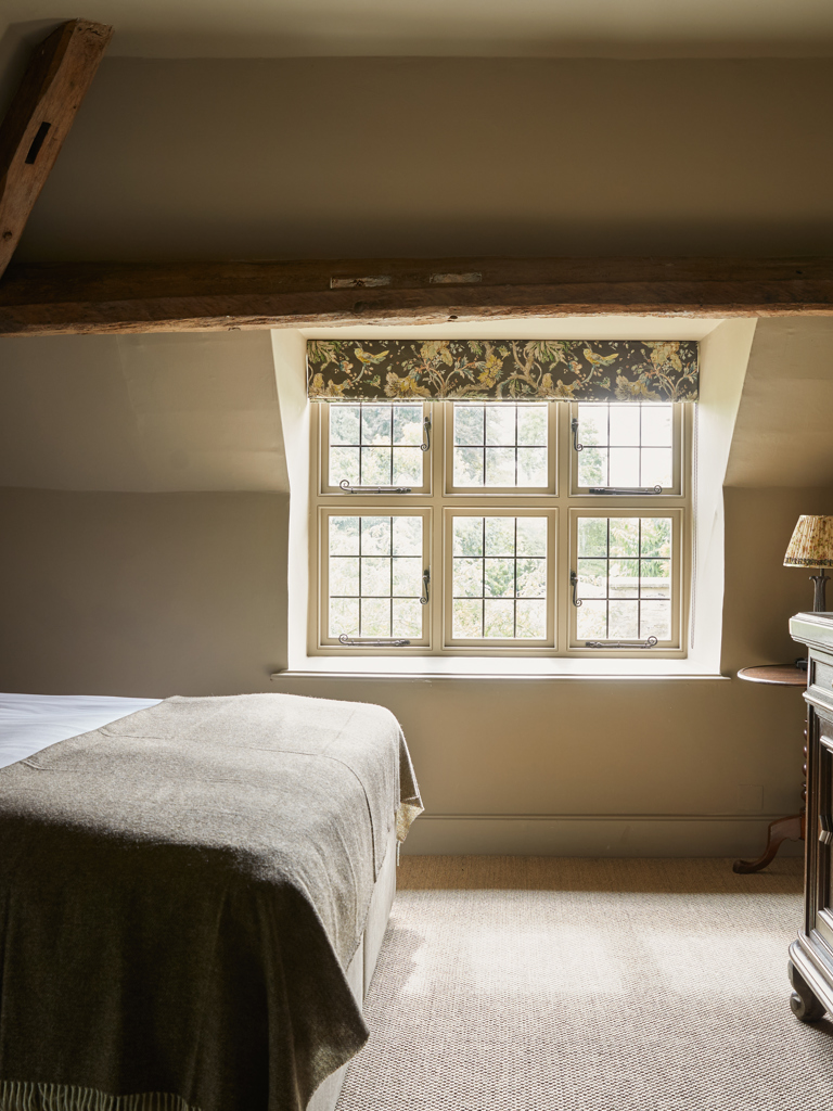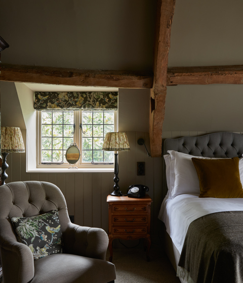 The snug is a comfortable hideaway that’s perfect for two people sharing. Packed with original features, the Snug has exposed beams, an open plan layout and very cosy twin beds with views out to Rosemary Verey’s arts and crafts style gardens at the back of the house. There is a big monsoon shower in the bathroom – everything you need for a great night’s rest.