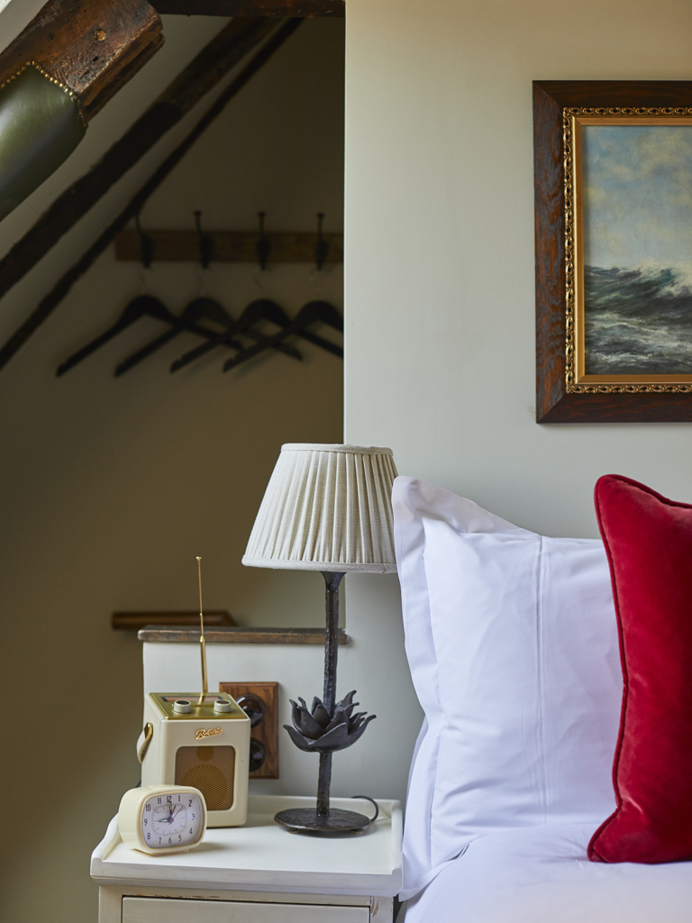 Our smallest bedroom located in the eaves – the Snug is an intimate and quirky room with original, exposed wooden beams that were built with the house, slanted ceilings and its own staircase up to the third floor. There is a walk-in monsoon shower in your separate bathroom and a large cosy bed in the bedroom. A comfortable stay for one, or for two who are happy to snuggle up.