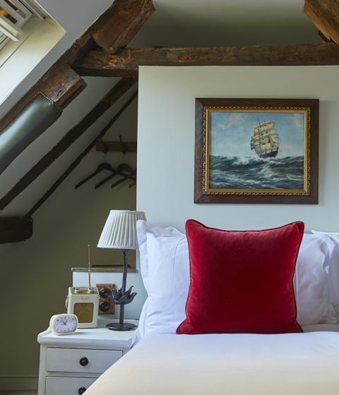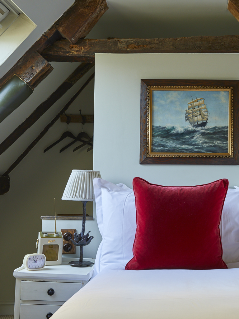 Our smallest bedroom located in the eaves – the Snug is an intimate and quirky room with original, exposed wooden beams that were built with the house, slanted ceilings and its own staircase up to the third floor. There is a walk-in monsoon shower in your separate bathroom and a large cosy bed in the bedroom. A comfortable stay for one, or for two who are happy to snuggle up.