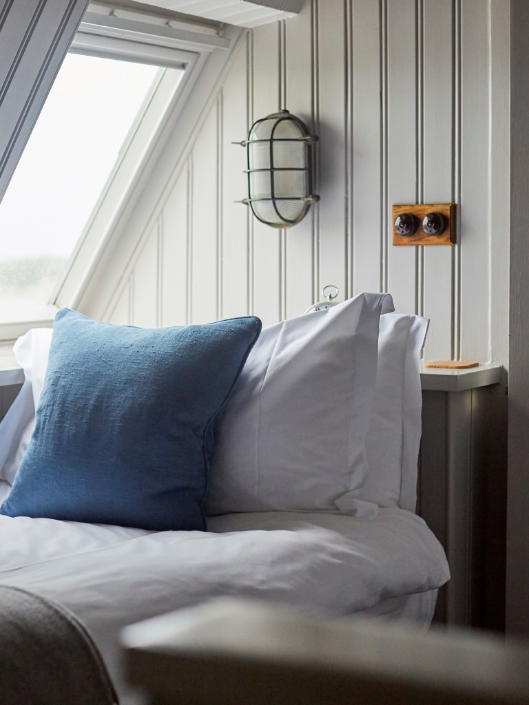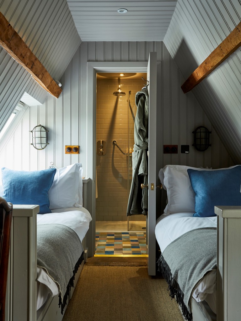 Tucked away in the eaves on the second floor of the main house, this small yet cosy bedroom is full of character with original exposed beams, two full-sized built-in single beds and a monsoon shower in the separate bathroom.