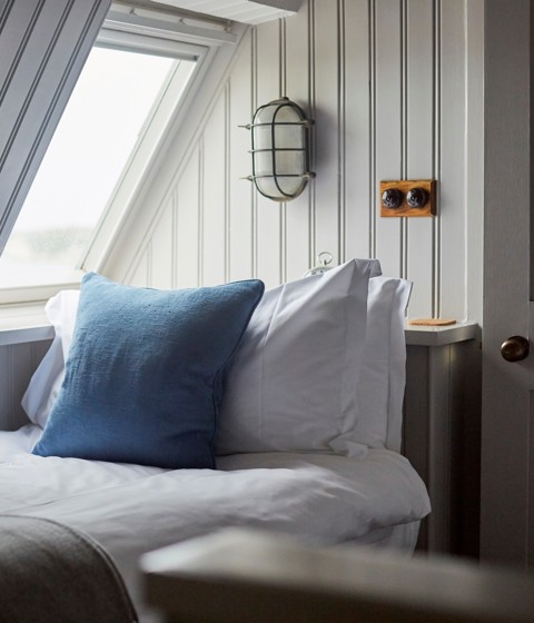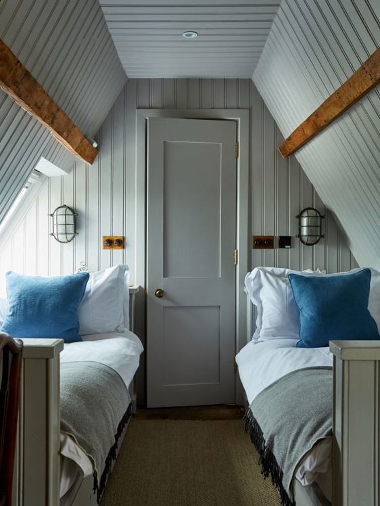 Tucked away in the eaves on the second floor of the main house, this small yet cosy bedroom is full of character with original exposed beams, two full-sized built-in single beds and a monsoon shower in the separate bathroom.