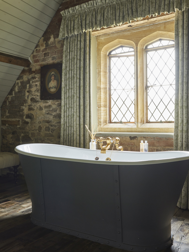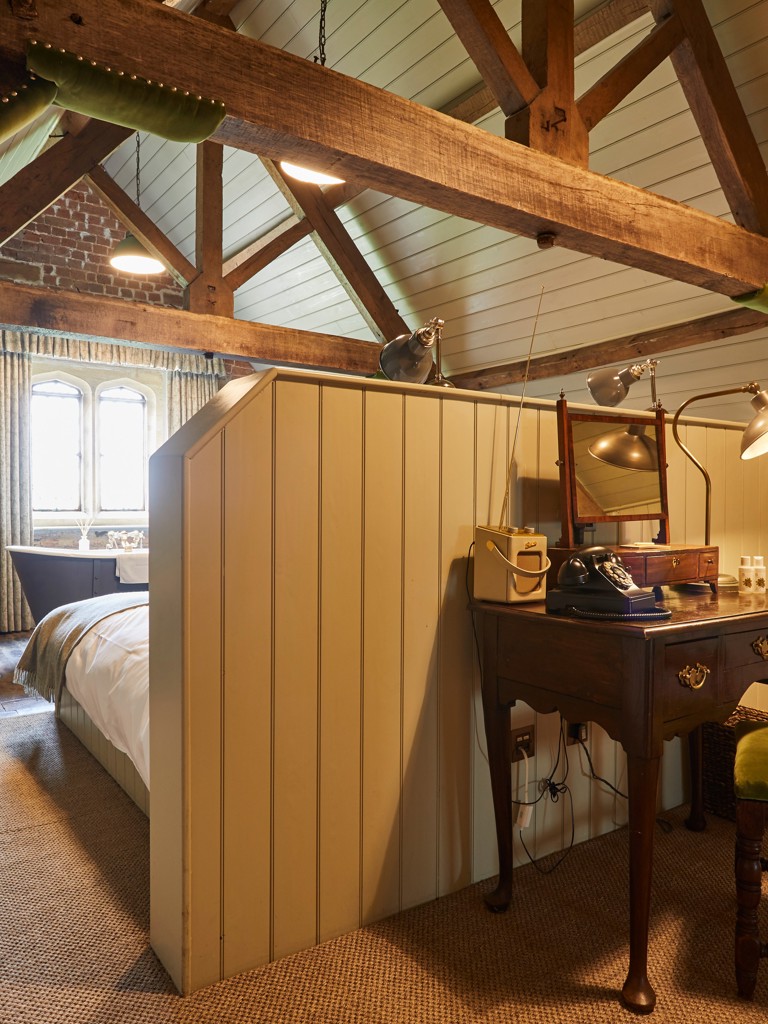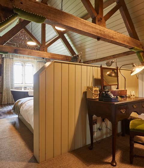 Tucked up on the second floor of the main house, the Attic is full to the brim with original, homey features from wooden beams and stone walls to rustic wooden flooring. Sink into the freestanding roll top bathtub in the bedroom underneath the Tudor-style windows, fall into the central, super-king size bed, or cosy up in the separate lounge and study area – you’re never far from somewhere deeply comfy to switch off and relax.