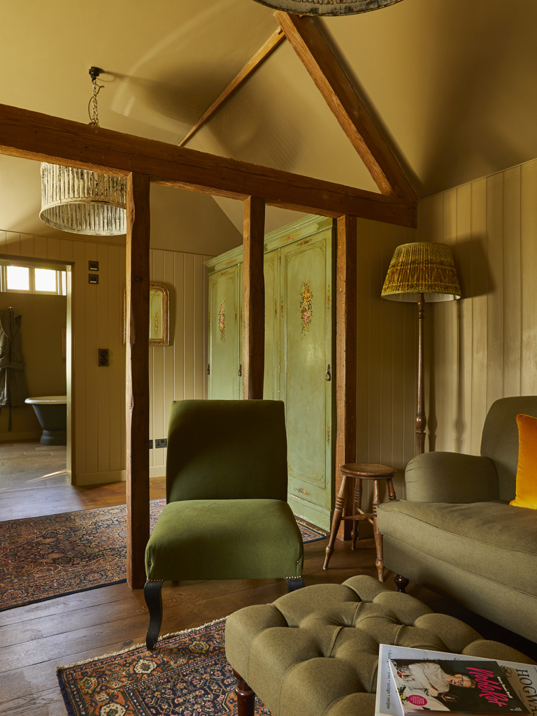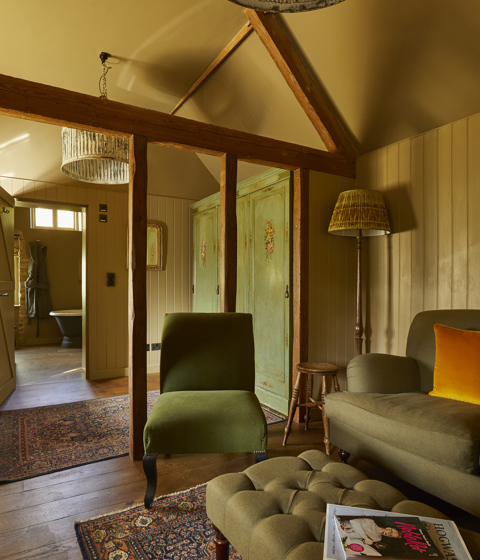 Tucked away from the main house with views out onto the original Potager Garden, this very comfortable room has its own separate lounge area with plenty of soft furnishings and armchairs that are just perfect for cosying up in front of the warming log burner. The Potting Shed has its own private terrace to relax on, and a separate bedroom with a comfortable big bed. It’s the perfect escape for two.